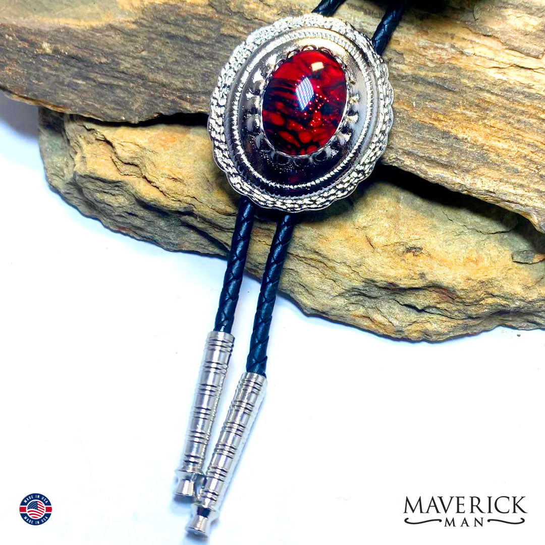 This 2 in silver concho bolo tie comes with one of our hand painted stones, made from black and red. It has ribbed silver tips and simple slide with 38 inches of braided leather cord and high-end pressure lock slide.