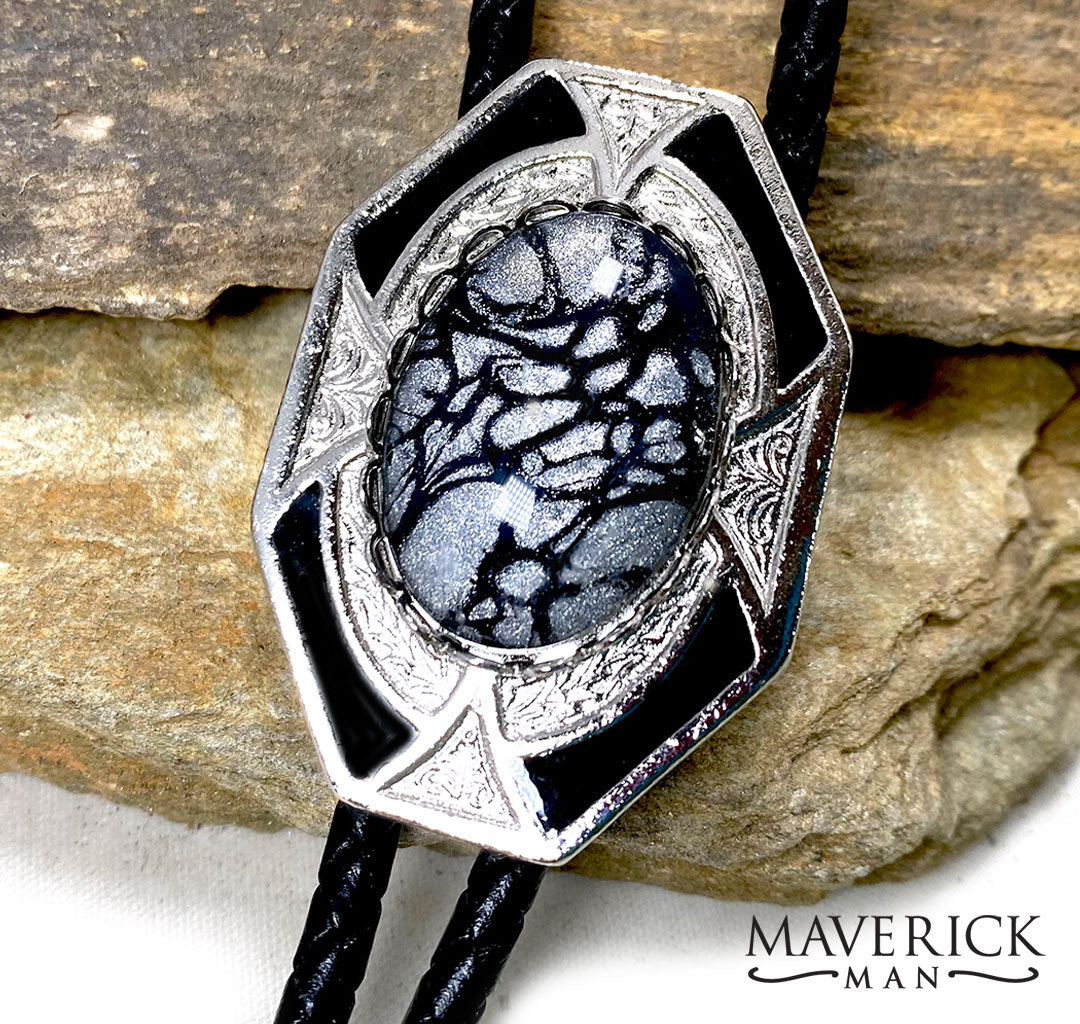 Our dressy geometric bolo has a hand painted stone from our Black and ... Collection, using black and platinum paints with real platinum fibers for a killer neutral. With pressure locking slide and silver tone ribbed tips.