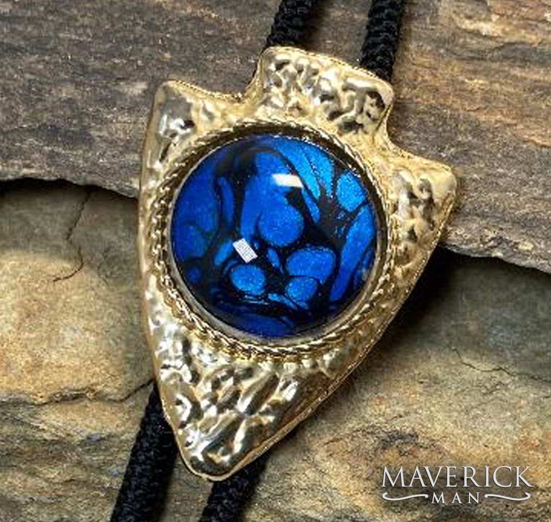 Handsome gold arrowhead bolo with sapphire blue hand painted stone - SET AVAILABLE