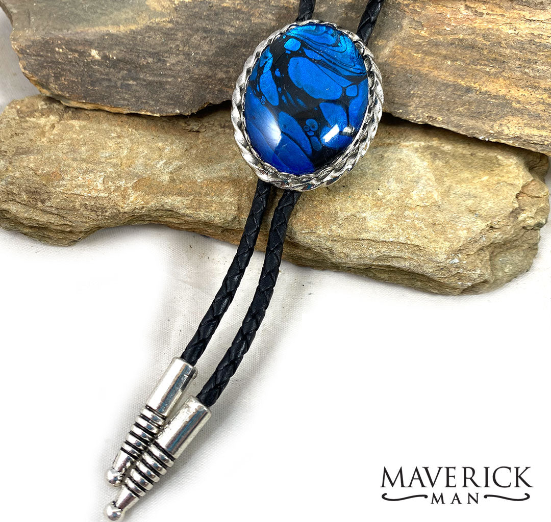 Every Maverick Man bolo comes with a 4-5mm braided leather cord. Our unusual stones are created as a piece of an original painting, preserved under glass. Unique. Distinctive... and totally uncommon.