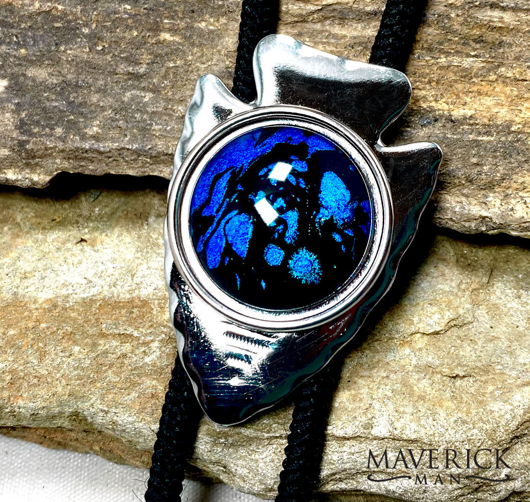 Silver arrowhead bolo with metallic blue and black hand painted stone