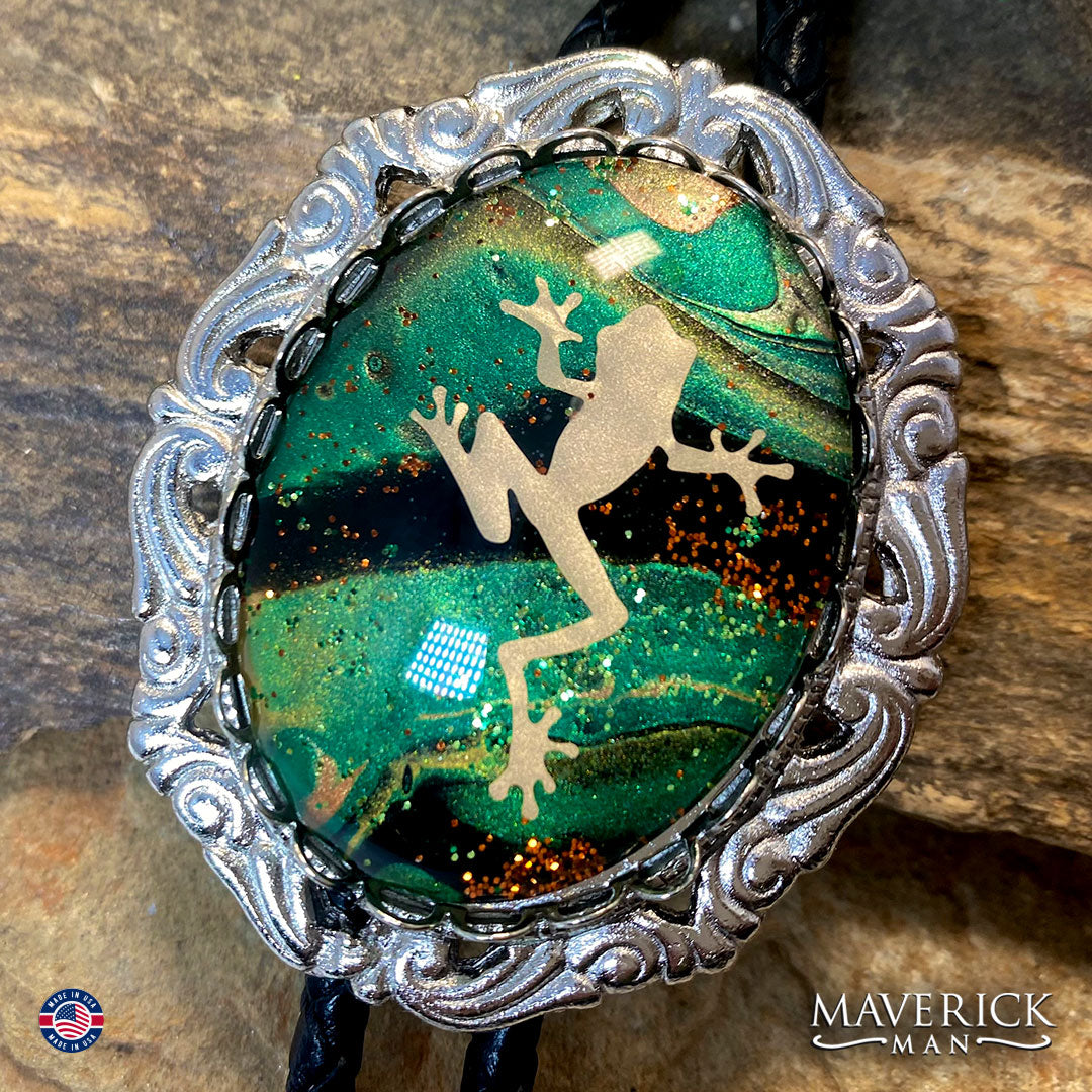 This 2.25 in silver filigree bolo tie, with a hand painted stone, is a great example of tradition - reimagined! Our stone is part of our Emerald City (greens) collection, made with 4 colors of acrylic paint, including three metallic colors - and that's not all! It's also got a frog detail per customer request. It has shiny silver tips and top-end pressure locking slide on 38 inches of braided leather cord.