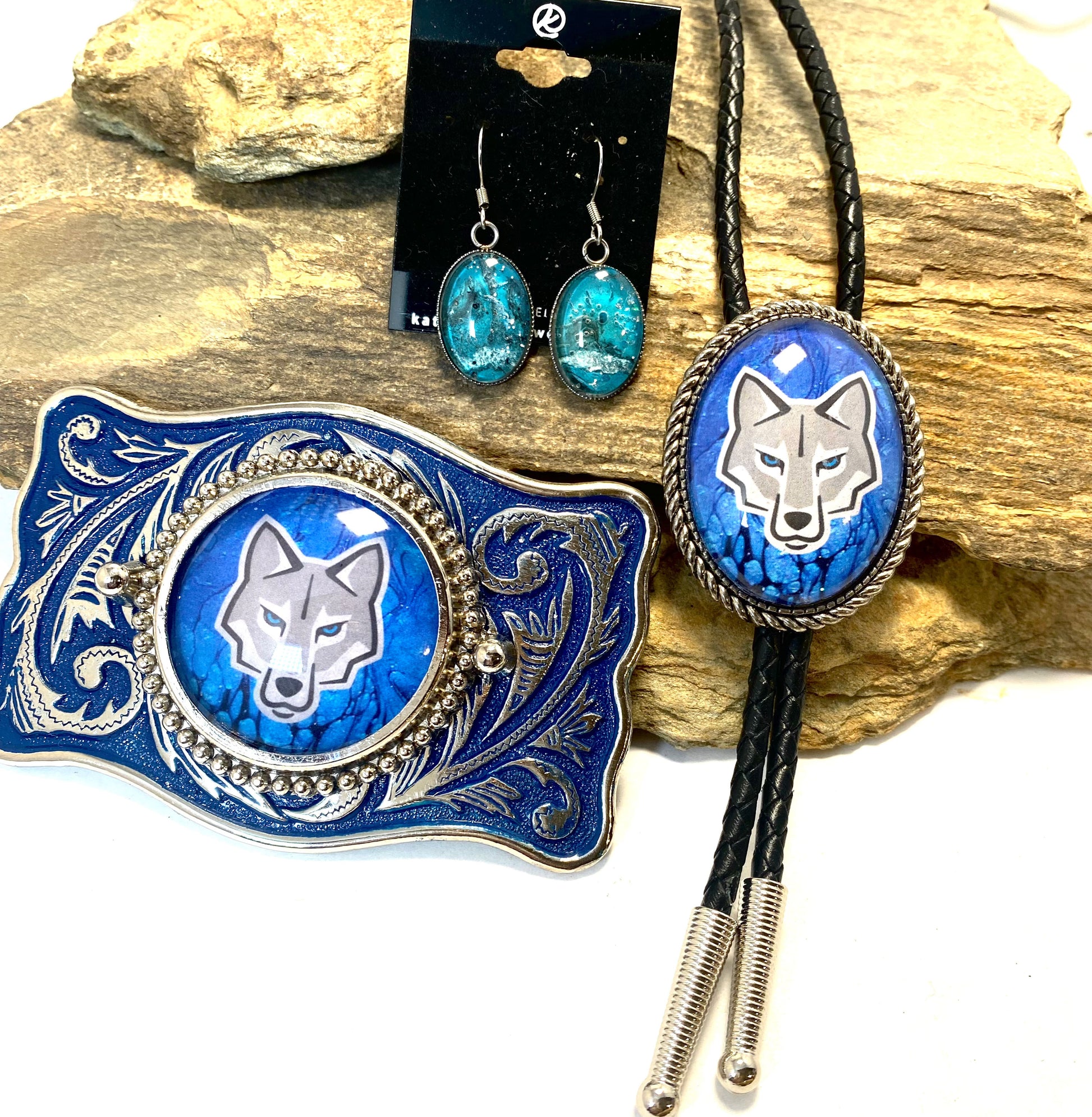 This 2 in braided silver bolo tie, with a hand painted stone, has been custom made for you with the wolf logo from your grandson's high school. It has basic silver tips and a flip-lock slide on 38 inches of braided leather cord. You also chose a rare blue buckle for the stone which is fabulous! And... this time there is a pair of earrings for your lady.