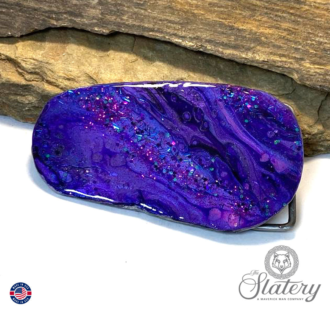 Our large 2.25 long by 2 inch wide slate bolo tie is hand painted with our purples collection of acrylic paints, with Color Shift paint (the lighter purple - a lot like auto paint that changes colors). Resin finish. 42 inch, 4mm black leather cord with silver dressy tips and stainless steel pressure lock slide.