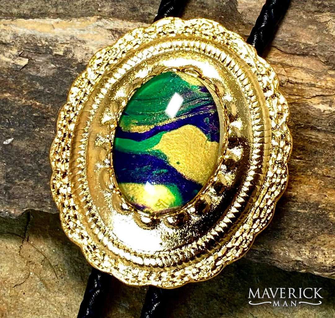 This handsome bolo is just under 2 inches and has one of our hand painted stones from the Party Gras collection using metallic gold with purple and green paints. Pressure locking slide; dressy gold tips; 4mm braided leather cord. Coordinating ladies' jewelry from the same painting available.
