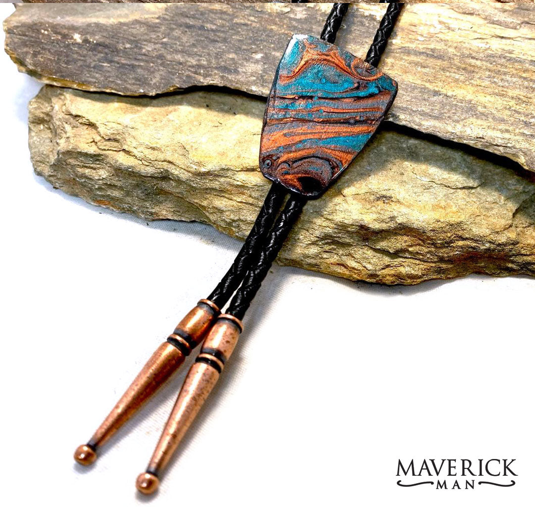 Handsome 1.5 inch slate bolo hand painted with our Copper collection of colors - metallic turquoise and copper paints, along with black. Resin finish.