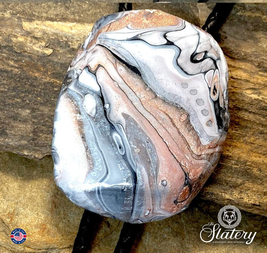 This unusual slate bolo tie is hand painted with our Black and white collection of acrylic paints, with metallic rose gold accents - just over 2 inches long. Resin finish. 4mm leather cord. High end, stainless steel pressure lock slide. Dressy, silver tone tips.