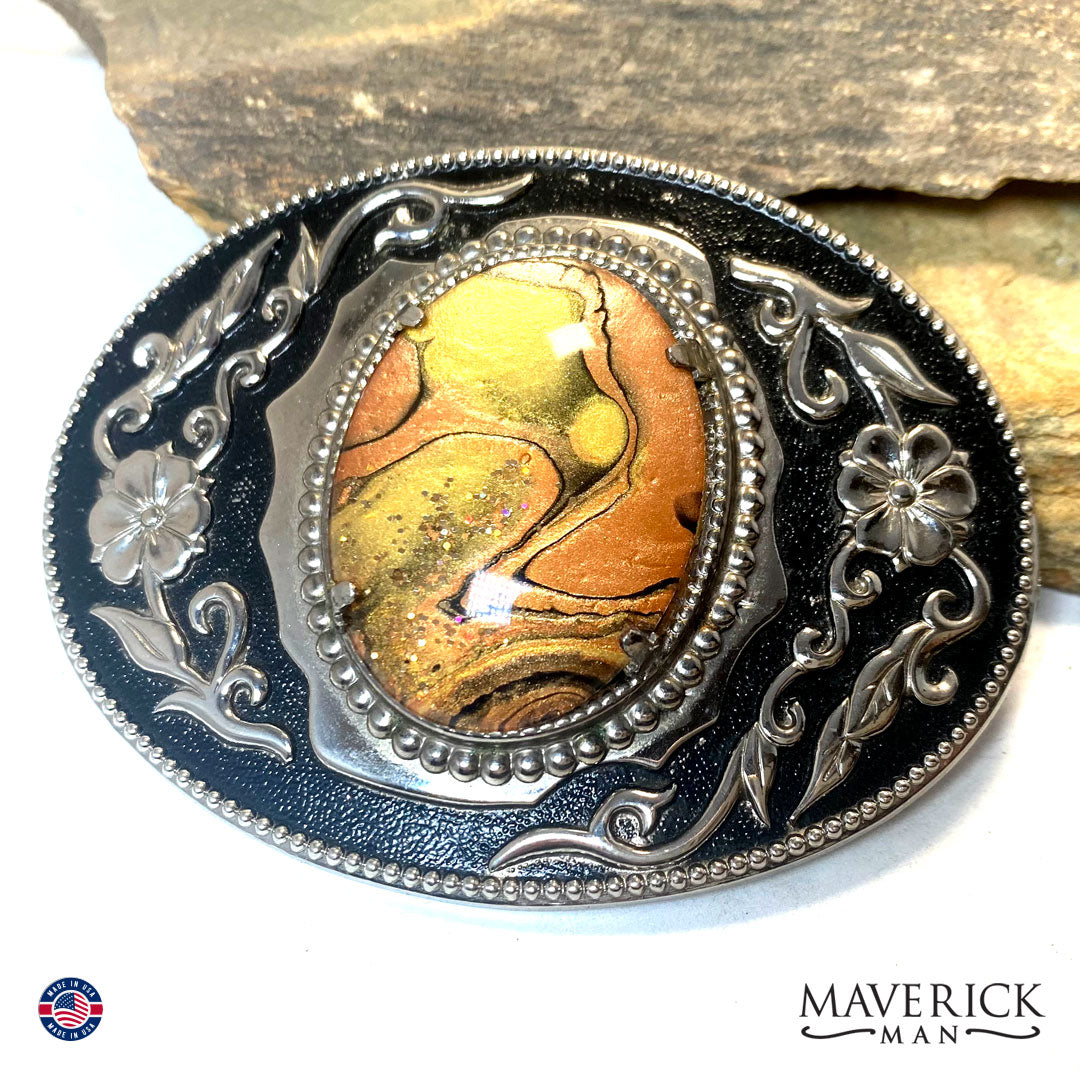 Buckle is 4 inches wide with silver filigree detail on ablack buckle. Sold as a set only.