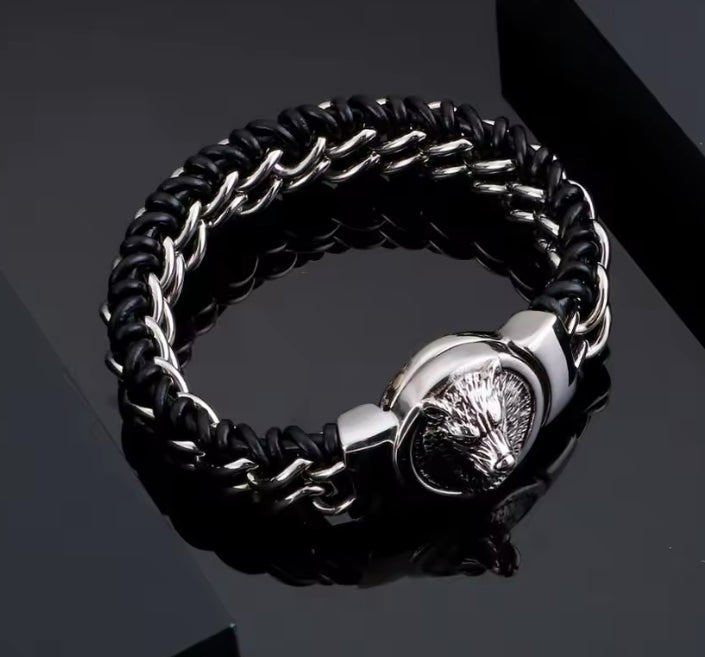 This sturdy, multi-strand leather and stainless steel wolf bracelet is solid. Strong magnetic closure means your bracelet is secure; the stainless steel means no polishing or turning colors on you. Very handsome. Try it with one of our stainless steel rings.