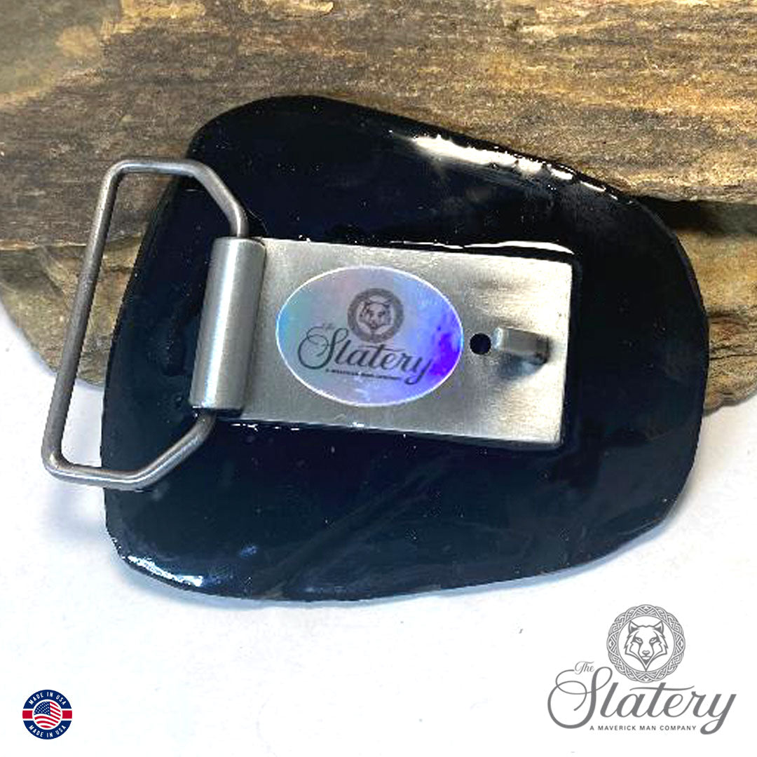 Talk about different! Our slate belt buckles are world exclusive and they are fabulous! Solid slate about 3.5 inches wide, this one has our Emerald City collection of green earthtones, using 3 metallic paints, along with black. It also has a heavy coat of UV resin front and back. Made for 1.5 inch belt.