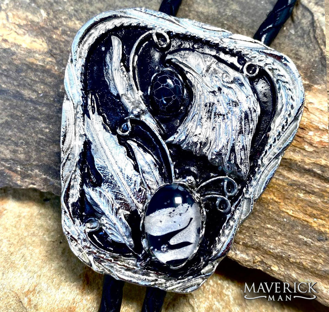 Our silver eagle bolo measures about 2 inches and has one of our hand painted stones from our Black and... collection, made with silver, and black paints, along with a small black howlite stone under the eagle's beak. Dressy silver tips; stainless steel pressure-lock slide.