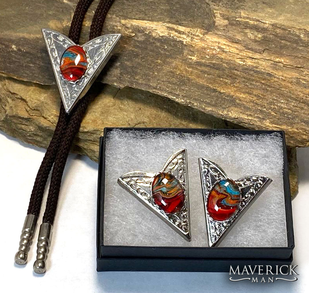 You've seen the "everybody's got one" bolos, buckles and tips. You've seen the high end ones made from turquoise, coral, and mother-of-pearl. Step up to Maverick Man handcrafted bolos, buckles and tips. Each one has a hand painted stone, using a special acrylic technique (yes, paint!) made in our home studio in Georgia, that gives our bolos, buckles, and tips a look you won't find anywhere else... In fact, we like to call that look - Distinctly Uncommon.