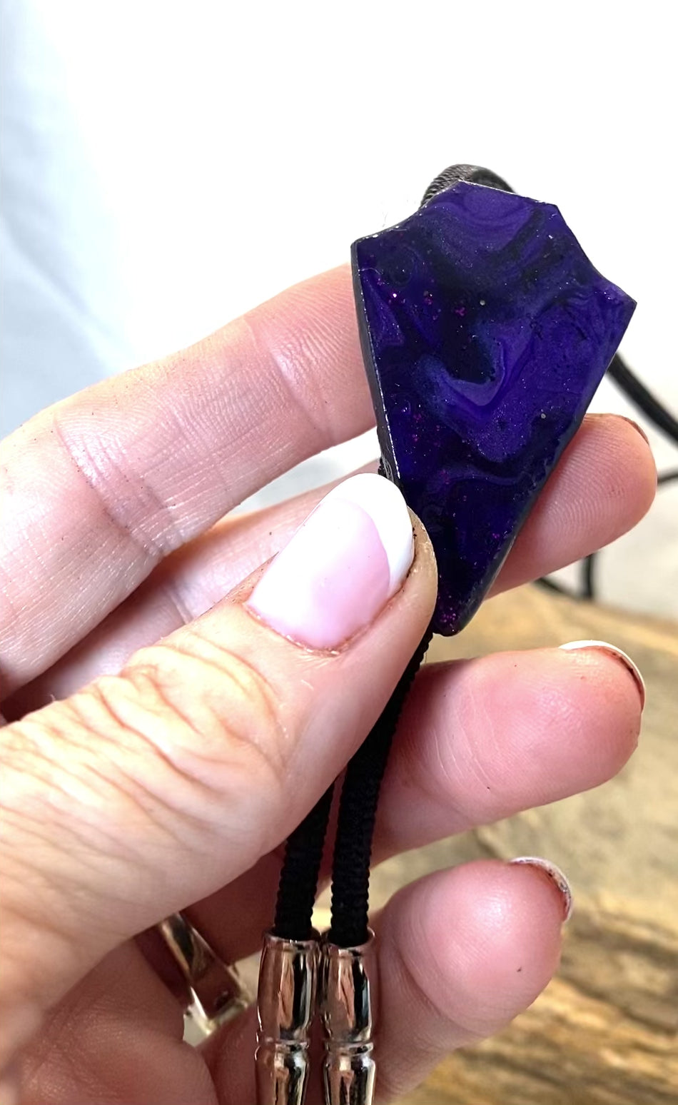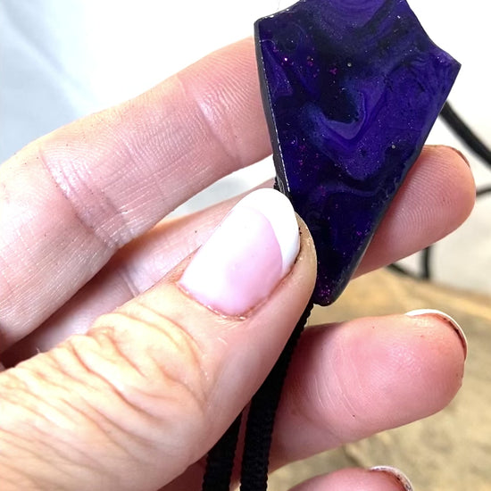 Our 2 inch arrowhead bolo tie is made from slate and hand painted with our purples collection of acrylic paints, including a Color Shift paint (the lighter purple - a lot like auto paint that changes colors). Resin finish. 38 inch, 4mm black nylon cord for easy on and off with no scuffing. Shiny silver tips; simple slide.