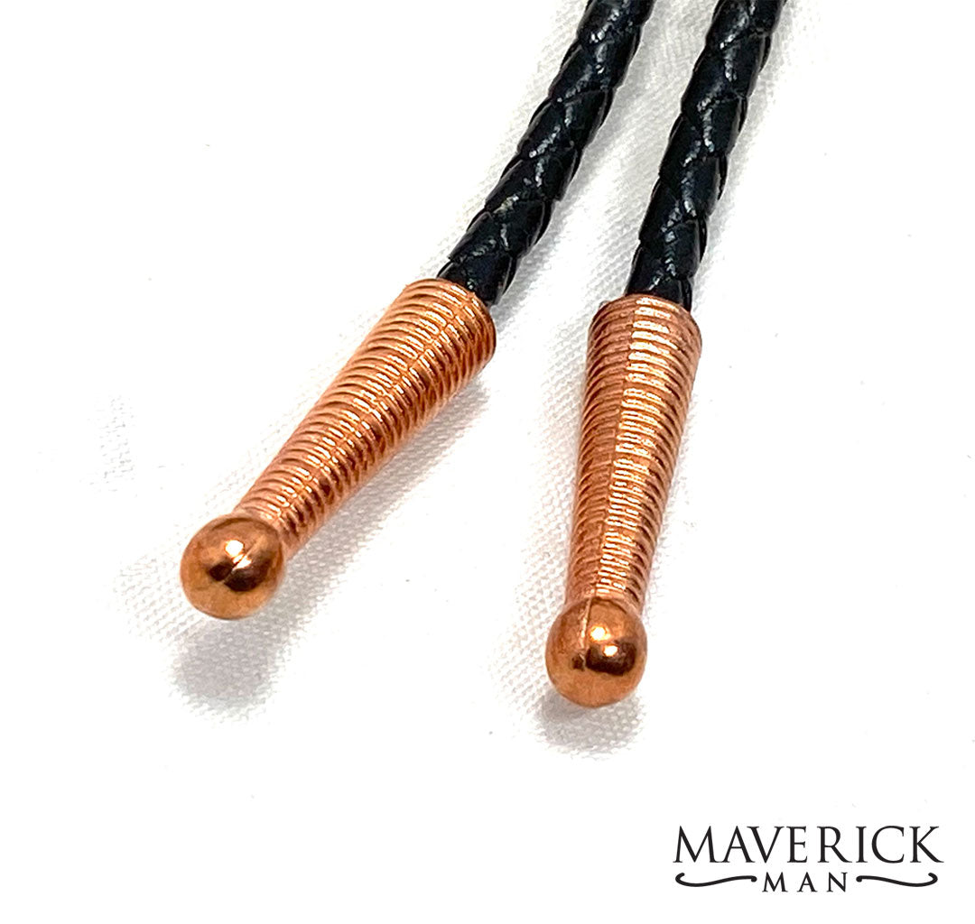 This  2" bolo is part of our Shades of Turquoise collection. It can be found in our Blues, and Copper collections. Copper tips; pressure locking slide.