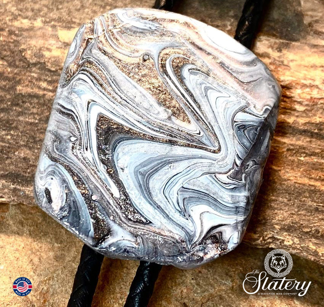 Our 1.75 inch slate bolo tie is hand painted with our Black and white collection of acrylic paints, with metallic rose gold accents. Resin finish. 4mm leather cord. High end, stainless steel pressure lock slide. Dressy, silver tone tips.