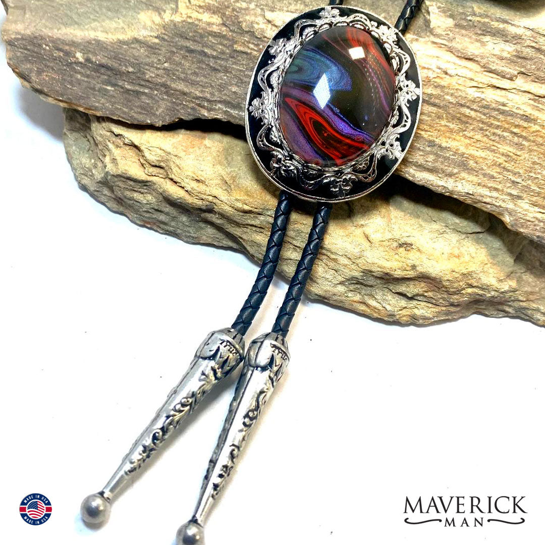 This 2 inch black and silver filigree bolo tie has a hand painted stone with colors of a southwest sunset - turquoise blues, red, black and purple. High-end pressure lock slide. 38 inch, 4mm black leather cord; dressy silver tips.